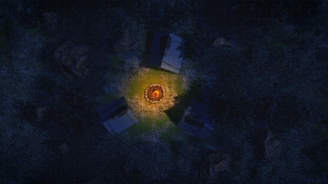 The entrance to the dungeon is further than expected, and the terrain is much more difficult than described by the map. There is no alternative, we will have to spend the night here. The heat of the fire cooks the food we have left and protects us from the cold night, but not from what watches us from the sinister veil of darkness.